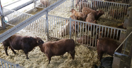 Großzügiger Offenstall für unsere Angus-Rinder. Nur hofeigenes Futter ohne jegliche Antibiotika.