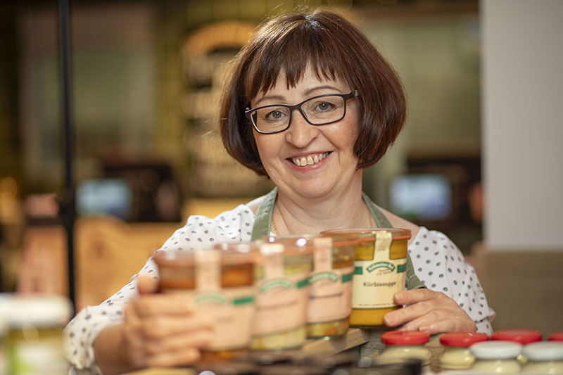 Mit der Begrüßung „Schön, dass du hier bist“ und mit viel Liebe hat Sabine Goertz den Hofladen aufgebaut, in dem sie seit der Eröffnung 2001 in der Scheune das Fleisch der hofeigenen Tiere und selbstgekochte Eintöpfe und Suppe verkauft.